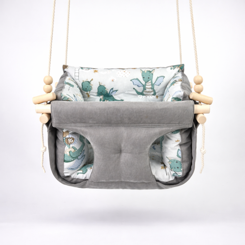 Подвесная детская качель «Премиум +», микровелюр серый с динозаврами